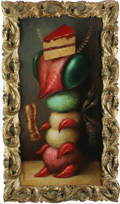 "Delicate Piece of Smoked Bacon with Ultra-processed Cake" 2024 oil on wood panel 9.8" x 17.7" framed to 11.8" x 20.6" $1300 USD
