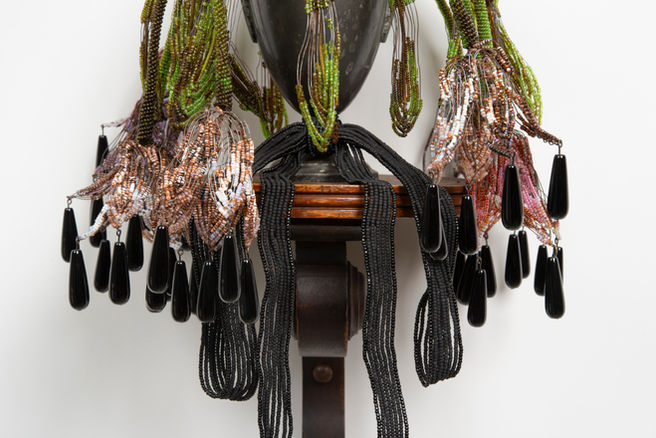 Reeves transforms a craft and tradition often relegated to the dusty and unrefined corners of old antique shops. In fact, many of the objects, beads and metal wire Reeves uses to make her work are themselves antiques, either passed down through her family, a long line of collectors, artists, and makers who have lived in Bucks County for generations; or discovered at any of the myriad antique treasure shops in the area. Reeves taught herself how to sculpt hand-beaded flowers, a process widely known as French beading, by purchasing them from these stores, disassembling them to learn their structure, then remaking flowers of her own. In this way, she not only honors the tradition of Victorian funeral object-making but also the hands of the many women who dedicated their skills to this laborious and beautiful craft.
