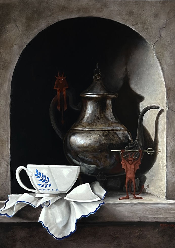 In fact, Melcher’s paintings strike us as more fun than fearsome despite their dark allusions. Opulent feathers and ridiculous wigs adorn decrepit skeletons. Tiny, mischievous devils wreak havoc in carefully constructed still lifes. And as we lean in to explore these mementos of death, we smile, reminded of “memento mori’s” opposite imperative: “memento vivere.” Through decadence and disobedience, we can “remember to live.”