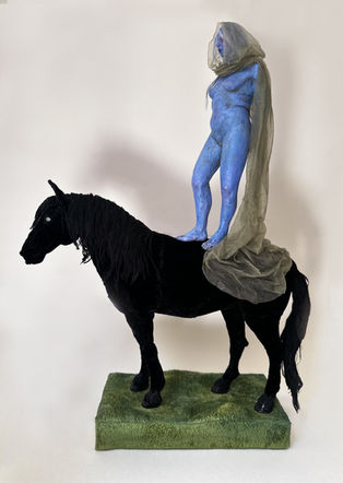 "Judith (Another World is Possible)" 2025 polymer and epoxy clay, fabric, thread, upholstery foam, cotton batting, acrylic paint, antique metal sequins, wire mesh 21.5"h x 14"w x 6"d on 6" x 6" base $2400 USD