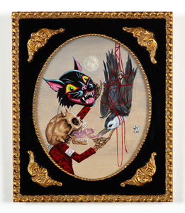 A Seattle native based in Buffalo, Joe Vollan (b. 1978) has been showing with Arch Enemy Arts since 2017; this is his first series after a two-year hiatus. We love Joe for the combination of dark humor and macabre fantasy he achieves in his work. Blending intricate and illustrative detailing—like the crisp lace and rendered skeletons seen here—with loose, flat backgrounds and folk-inspired visual language, Vollan makes gothic stories with paint. And we are grateful every time he writes.